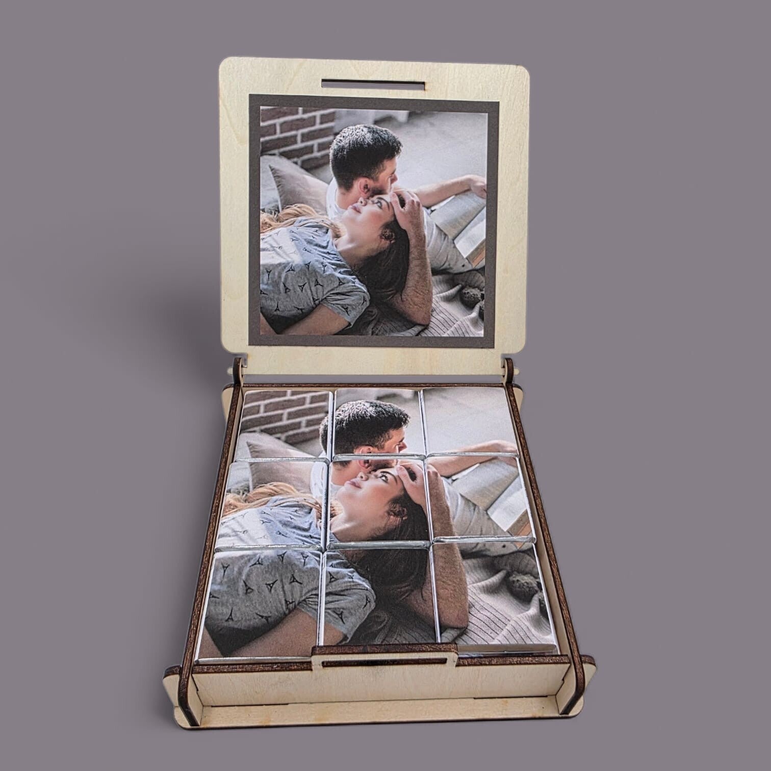 Coffret rustique en bois de tilleul comprenant 27 chocolats personnalisés – format du coffret carré. Chocolats sur trois étages (3 x 9). Le premier étage, photo reproduite en puzzle, et les deux étages du dessous, l'image reproduite à l'unité sur chaque napolitain.