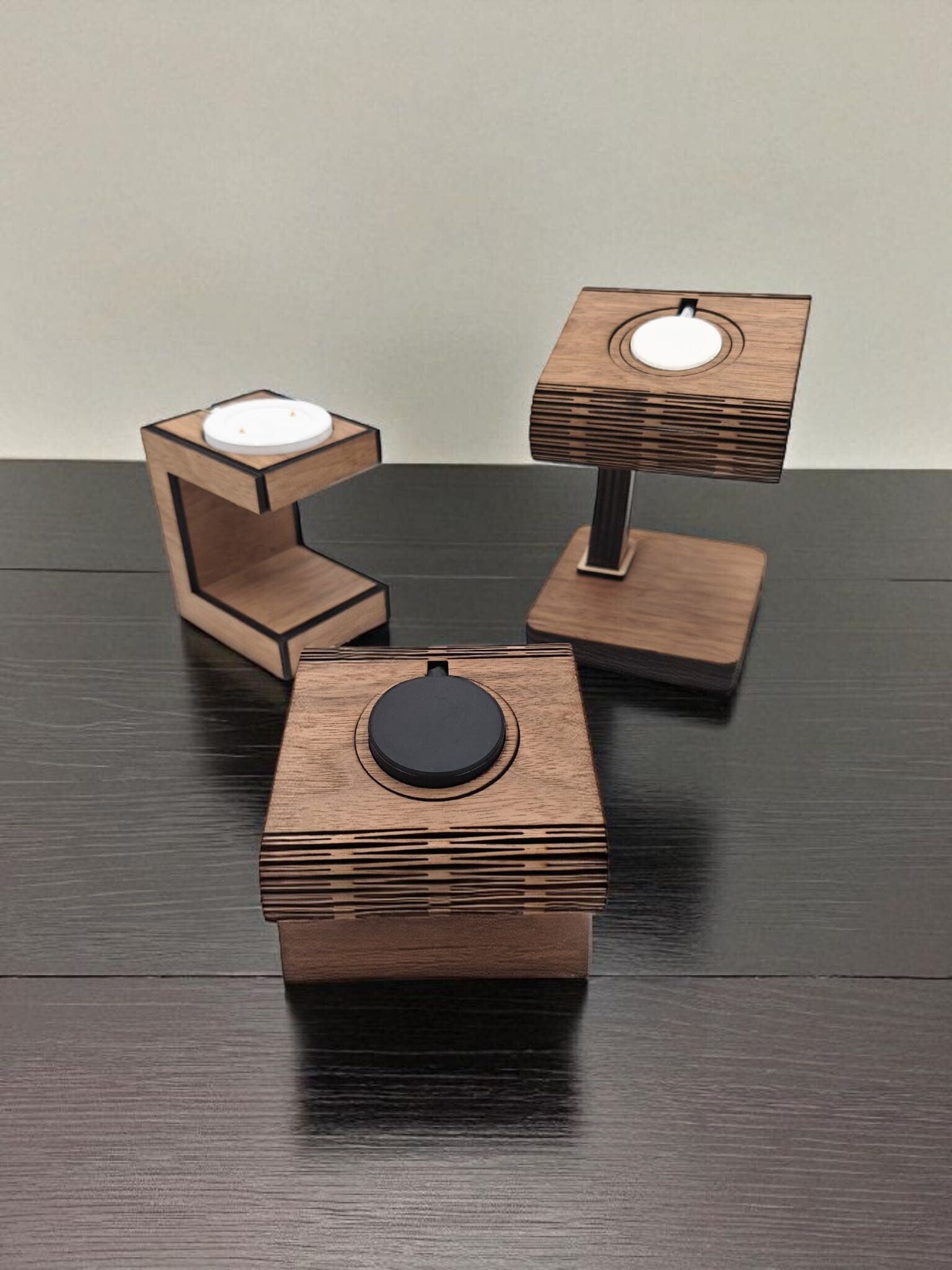 Station de recharge en bois de noyer pour montre connectée. Fourni avec différents diamètres de bagues afin d'épouser les chargeurs de montres : Samsung, Honor, Apple, Xiaomi… Pour toute autre marque, nous contacter afin d'adapter le diamètre du support montre. La station est fournie avec le chargeur.