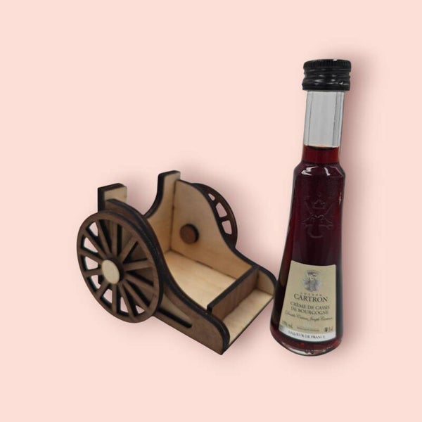 Crème de cassis de Bourgogne, maison Joseph Cartron, présentée en canon d'artillerie.